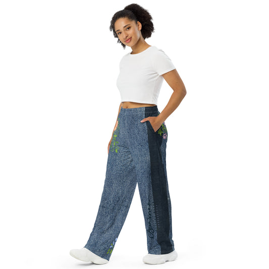 Unisex Wide Leg Faux Denim Print Floral Pants - Women