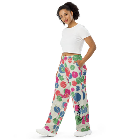 Wide Leg Tossed Medium Pastel Dots On White Pants - Women
