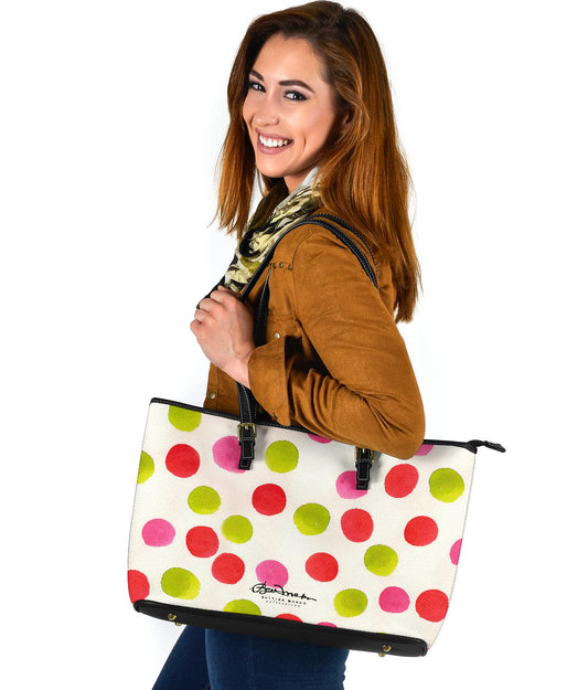 Water Color Polka Dots Large Leather Tote Bag