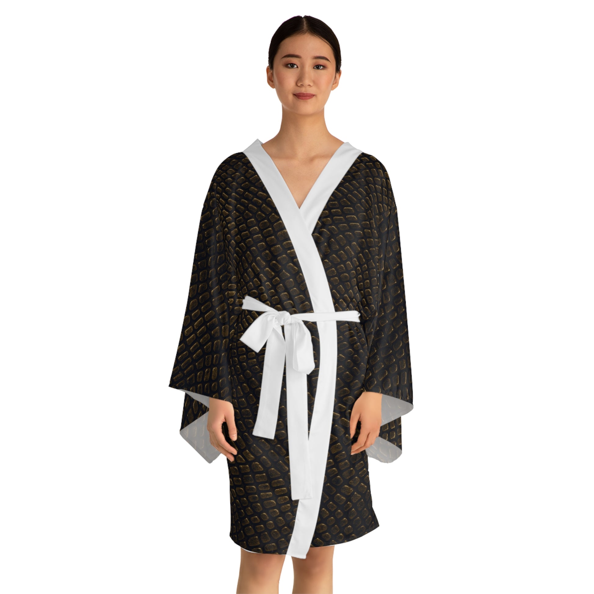 Late-night warmth and tactile luxury meet playful edge in this mid-length kimono robe. The lightweight, smooth polyester drapes in flowing bell sleeves and a flattering silhouette that slips on easily at home or steps out confidently at evening gatherings. The rich, textured pattern reads like aged leather—deep browns with subtle highlights—bringing an earthy, vintage vibe without weight. Contrast front edging and the tie are offered in black or white to anchor the design.