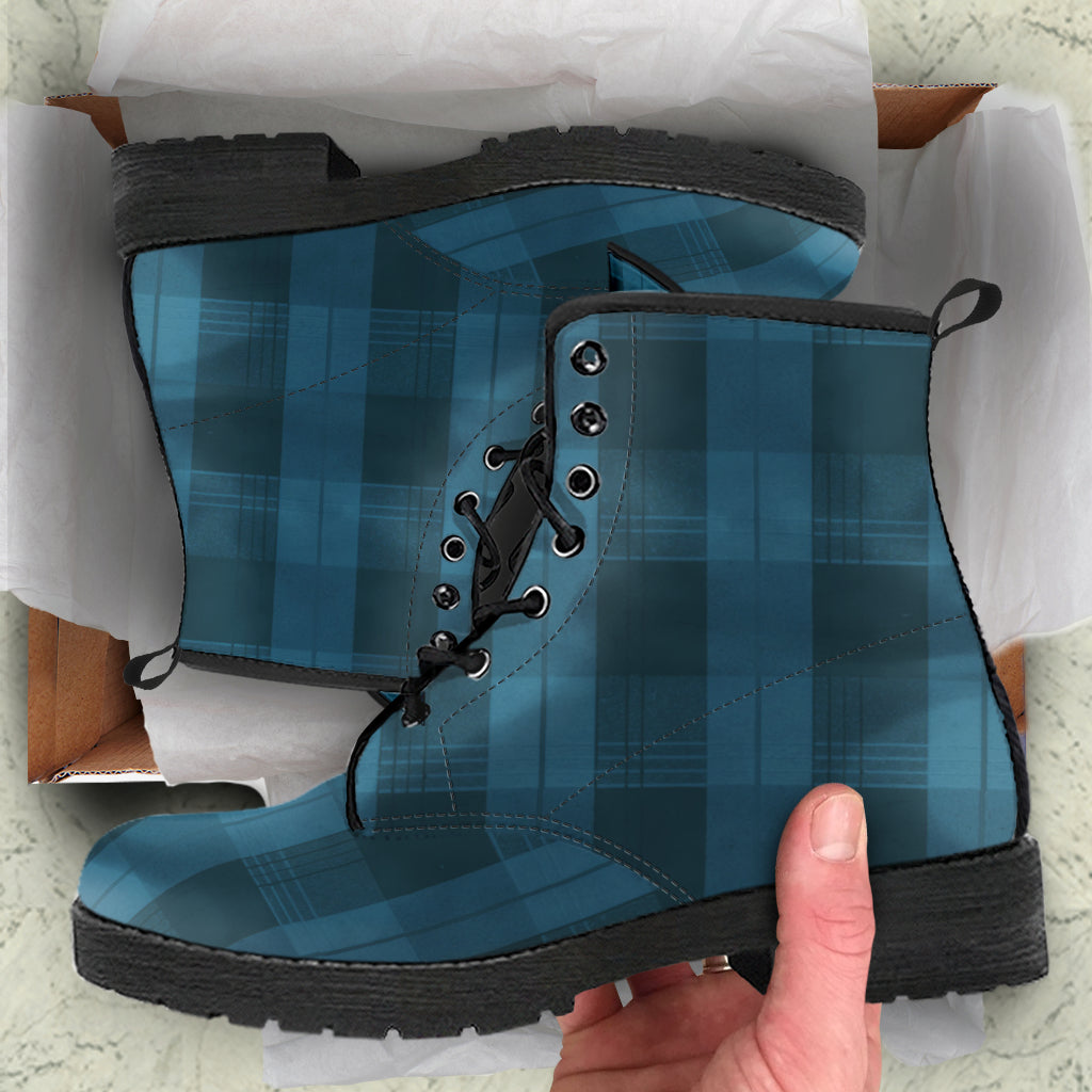 Teal Plaid Leather Boots (Vegan)