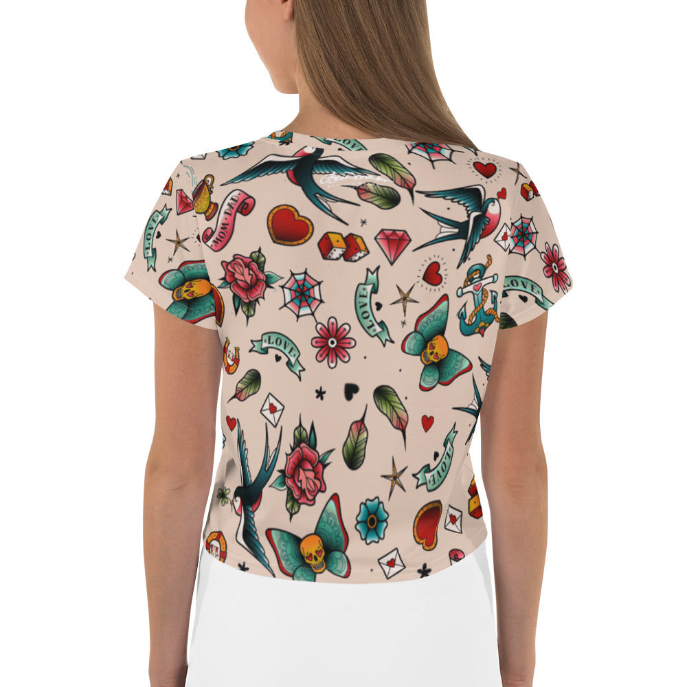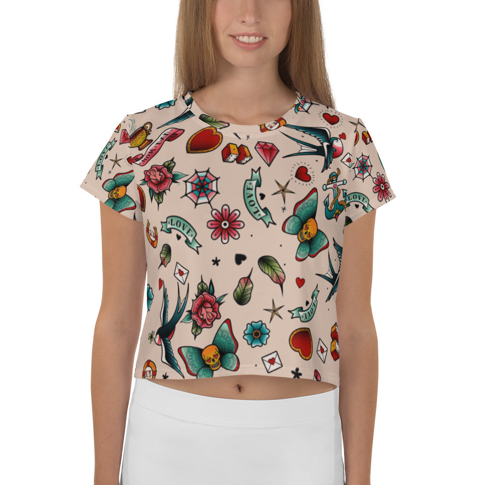 Looking for you next wardrobe favorite? Well, look no further because this crop tee is printed and sewn to fit you just right. To top that off, the original all-over design is definitely worth showing off, so don't hesitate to own one of these tees - they're meant to be adored.